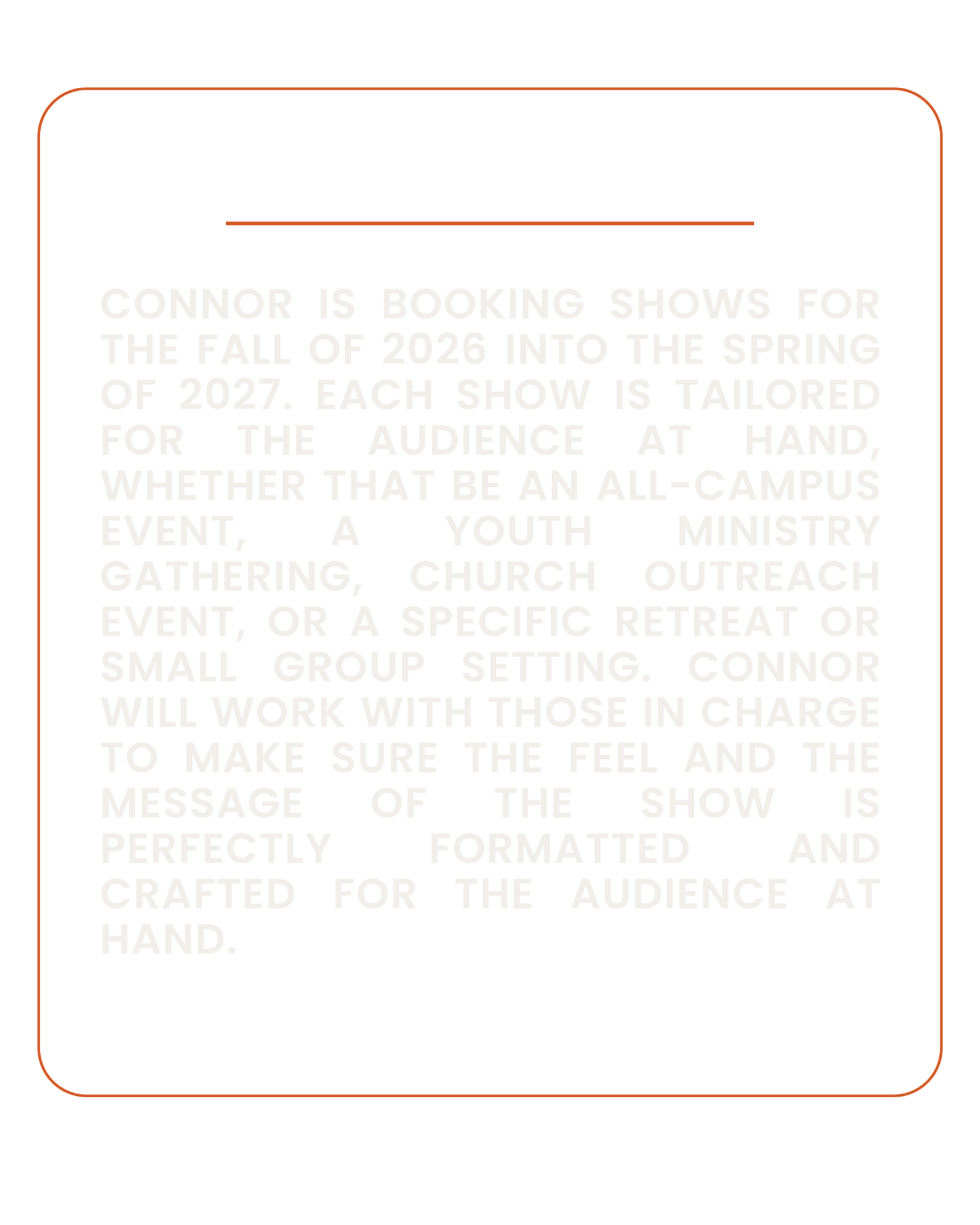 THROUGH POWERFUL MUSIC, AUTHENTIC VULNERABILITY, AND A MESSAGE ROOTED IN SCRIPTURE, CONNOR CREATES AN ENVIRONMENT WHERE STUDENTS AND YOUNG ADULTS ARE REMINDED THAT GOD WALKS WITH THEM THROUGH EVERY SEASON OF LIFE — THE CONFUSION OF NEW BEGINNINGS, THE PRESSURE TO HAVE IT ALL FIGURED OUT, THE PIVOTAL MOMENTS THAT DEFINE A GENERATION, AND EVERYTHING IN BETWEEN.